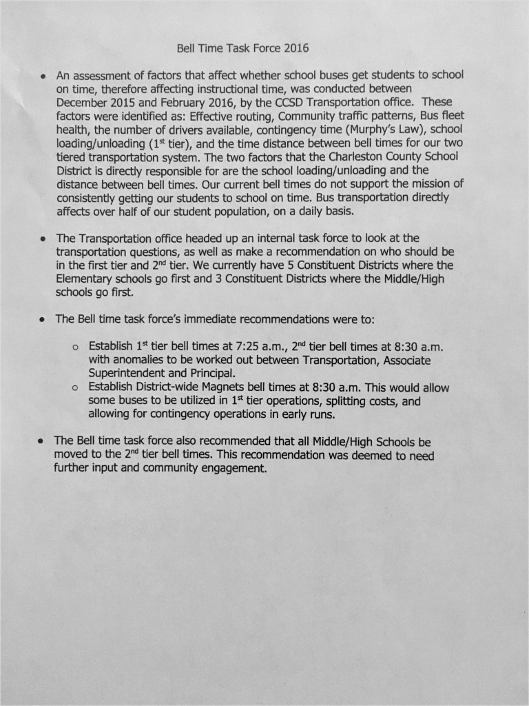 - In 2016, CCSD carried out a “Bell Time Task Force”. It was not made clear who exactly was on this task force but it was an internal group of people at CCSD’s transportation office.