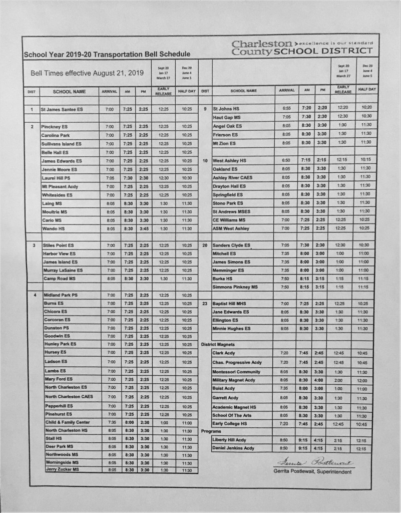 There was a great turnout of James Simon parents for the D20 meeting. Thank you to everyone that attended. I would estimate about 10 parents made public statements before the D20 board. All of them were against the proposed 7:25 am school start time. We asked the D20 board to relay our concerns to the Board of Trustees and to the superintendent. William “Jeff” Scott (william_scott@charleston.k12.sc.us) who is in charge of busing for CCSD (https://www.ccsdschools.com/transportation) attended the meeting and made a statement regarding CCSD’s stance on the school start time issue.